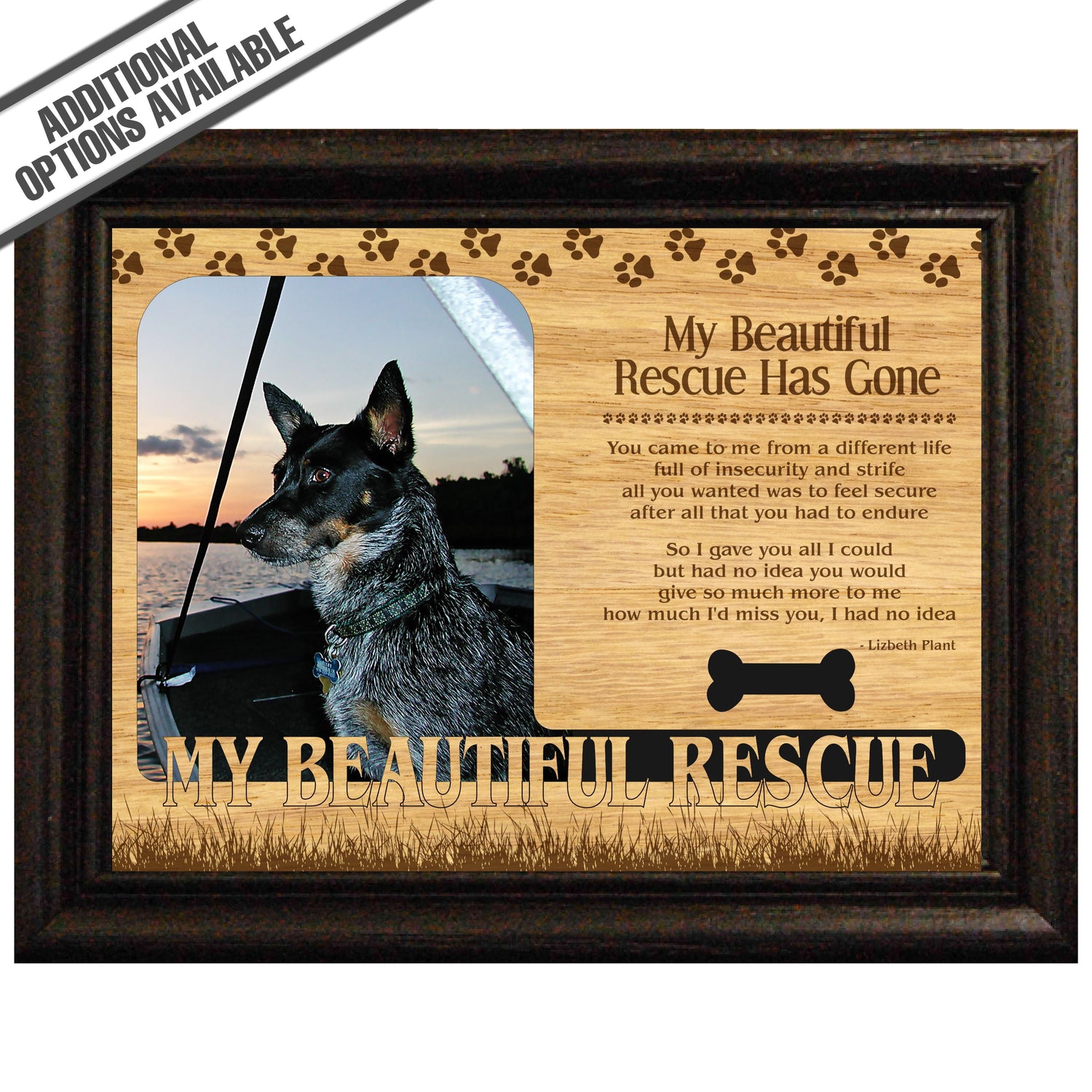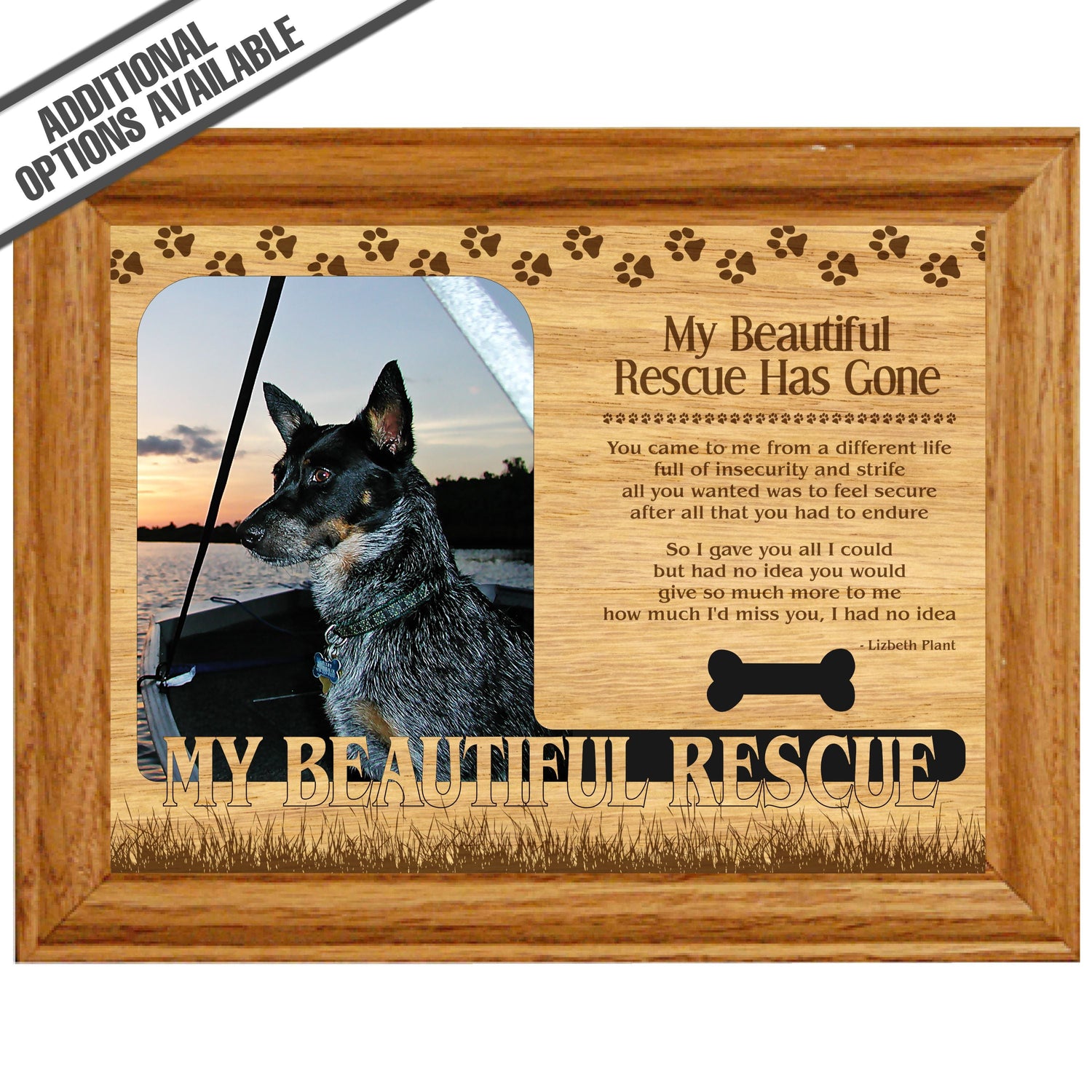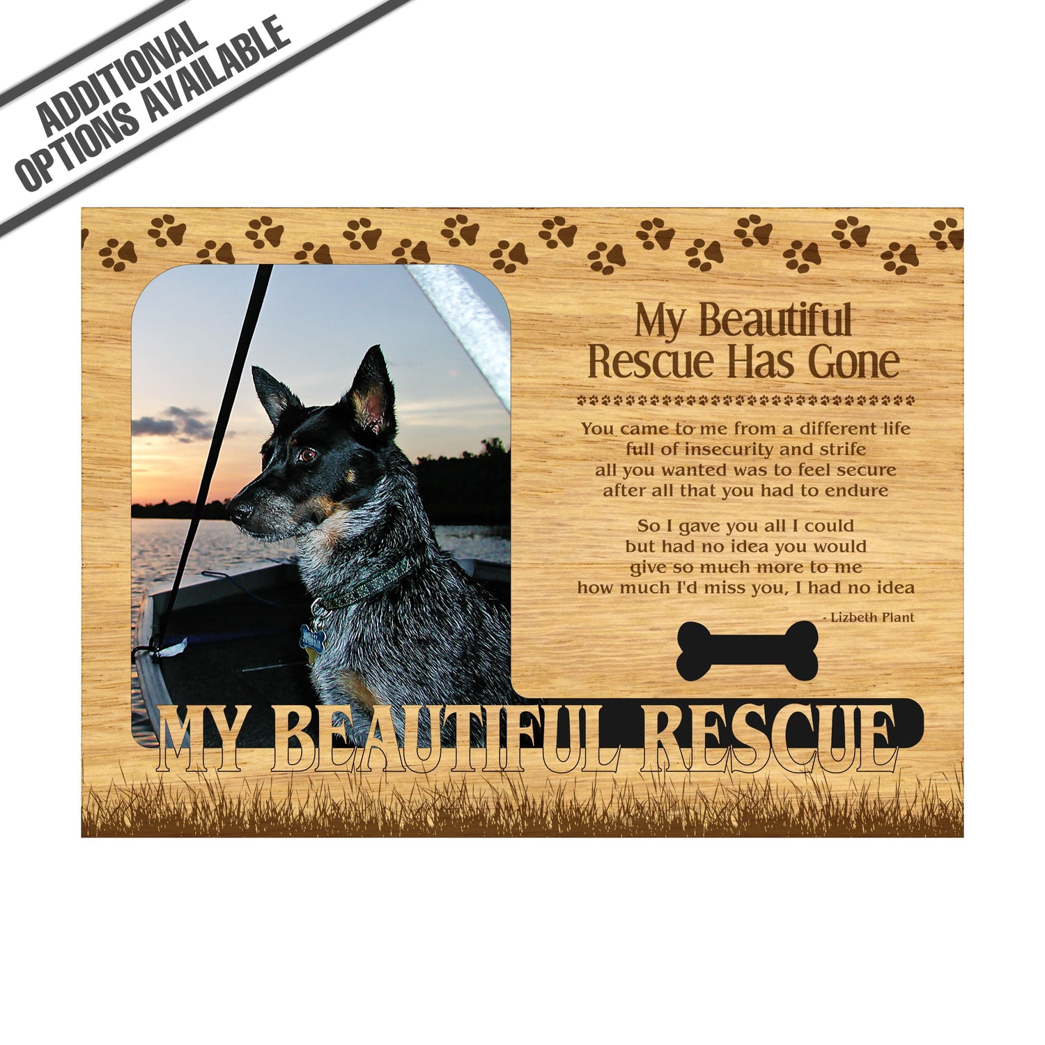 Celebrate the unique bond between you and your dog with our exquisite "My Beautiful Rescue Has Gone" wooden photo frame. This beautifully crafted wooden frame showcases engraved paw print, capturing the essence of your furry friend in a stylish and heartwarming way. Perfect for displaying your favorite photo, this frame not only serves as a cherished keepsake but also highlights the playful and loyal personality traits of you rescue dog. A thoughtful gift for dog lovers, it adds a personal touch to any home decor while honoring the love and companionship of your pet. Our FrameWorks magnetic mattes are the best way to accentuate any picture. Prefect for a fridge, locker, file cabinet and more, with a strong magnetic backing. Our FrameWorks material is lightweight making it a great souvenir to pack or mail.