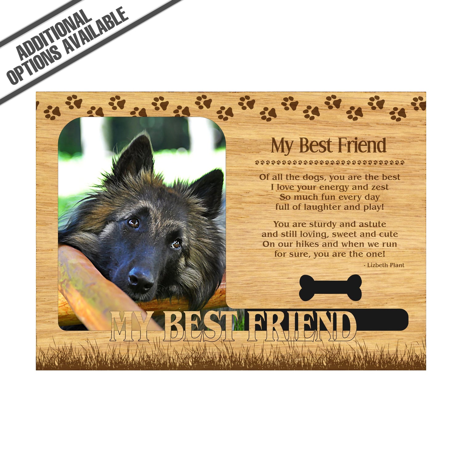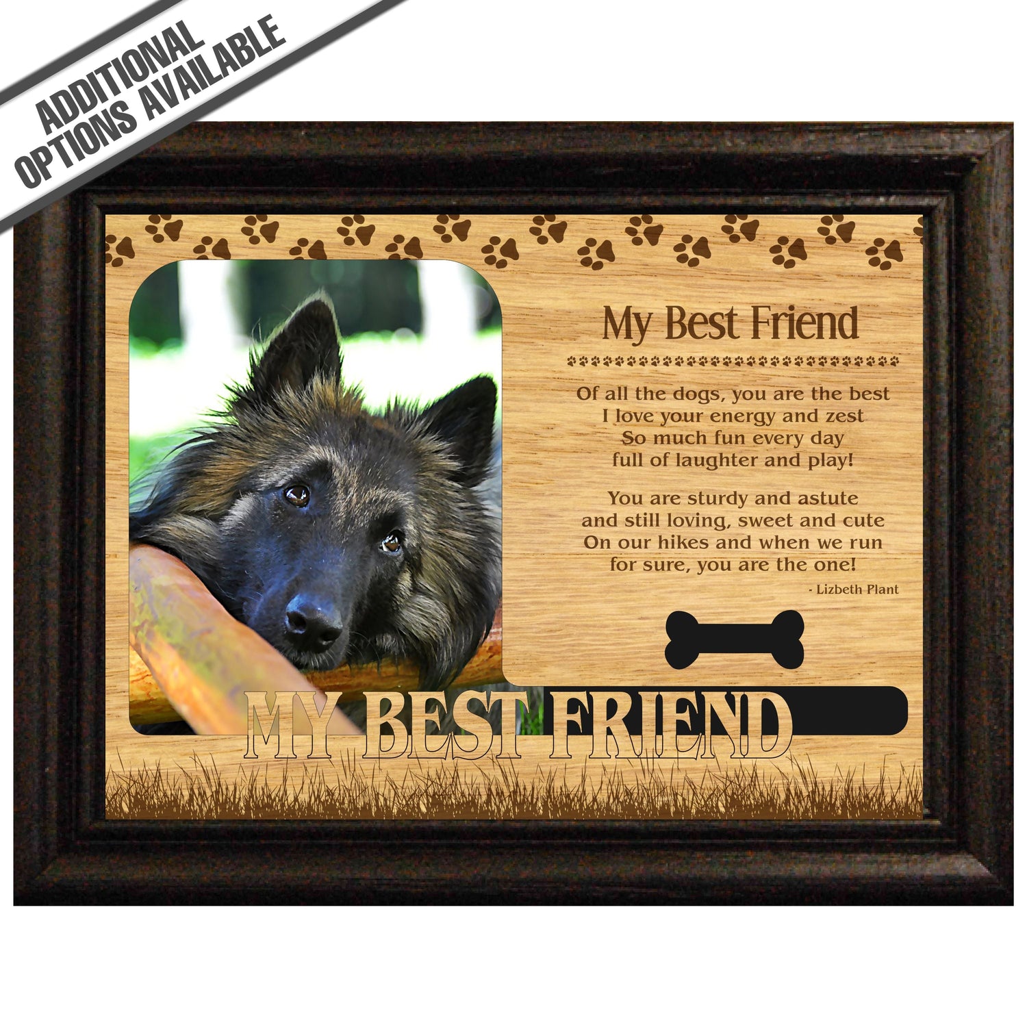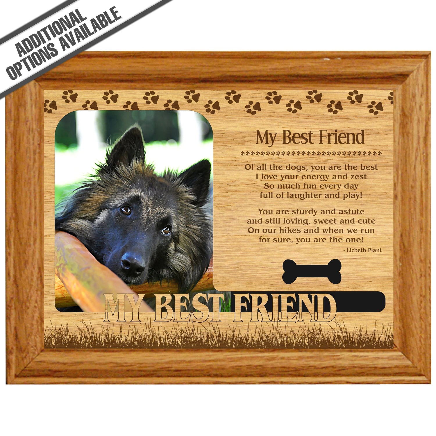 Celebrate the unique bond between you and your dog with our exquisite "My Best Friend" wooden photo frame. This beautifully crafted wooden frame showcases engraved paw print, capturing the essence of your furry friend in a stylish and heartwarming way. Perfect for displaying your favorite photo, this frame not only serves as a cherished keepsake but also highlights the playful and loyal personality traits of your loyal dog. A thoughtful gift for dog lovers, it adds a personal touch to any home decor while honoring the love and companionship of your pet. Our FrameWorks magnetic mattes are the best way to accentuate any picture. Prefect for a fridge, locker, file cabinet and more, with a strong magnetic backing. Our FrameWorks material is lightweight making it a great souvenir to pack or mail.