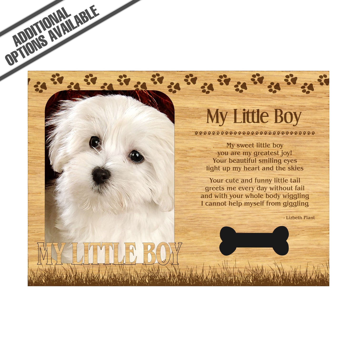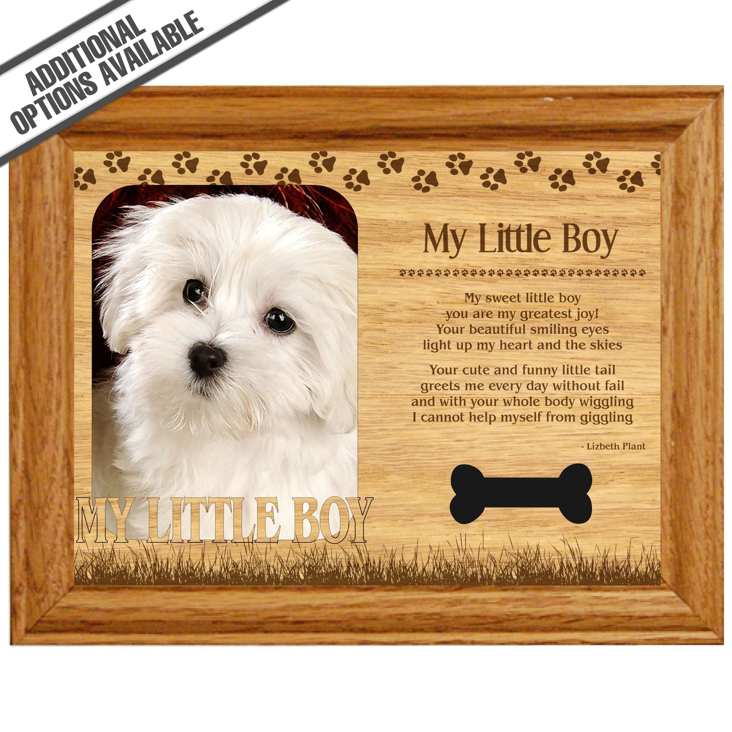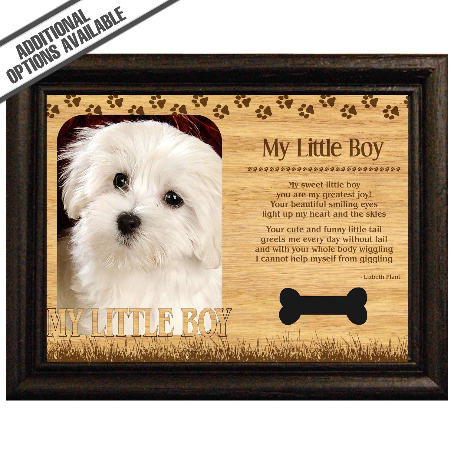 Celebrate the unique bond between you and your dog with our exquisite "My Little Boy " wooden photo frame. This beautifully crafted wooden frame showcases engraved paw print, capturing the essence of your furry friend in a stylish and heartwarming way. Perfect for displaying your favorite photo, this frame not only serves as a cherished keepsake but also highlights the playful and loyal personality traits of your loving dog. A thoughtful gift for dog lovers, it adds a personal touch to any home decor while honoring the love and companionship of your pet. Our FrameWorks magnetic mattes are the best way to accentuate any picture. Prefect for a fridge, locker, file cabinet and more, with a strong magnetic backing. Our FrameWorks material is lightweight making it a great souvenir to pack or mail.