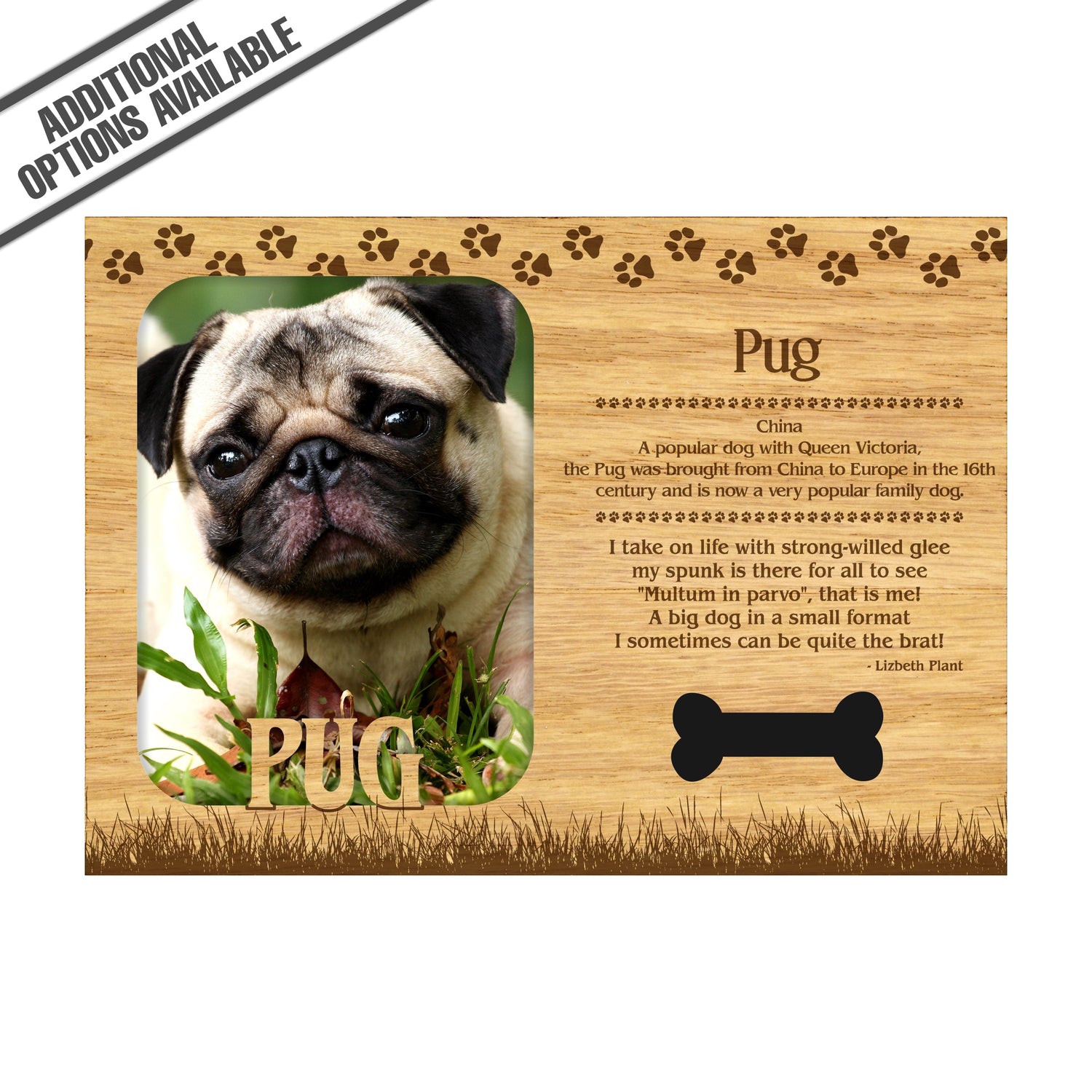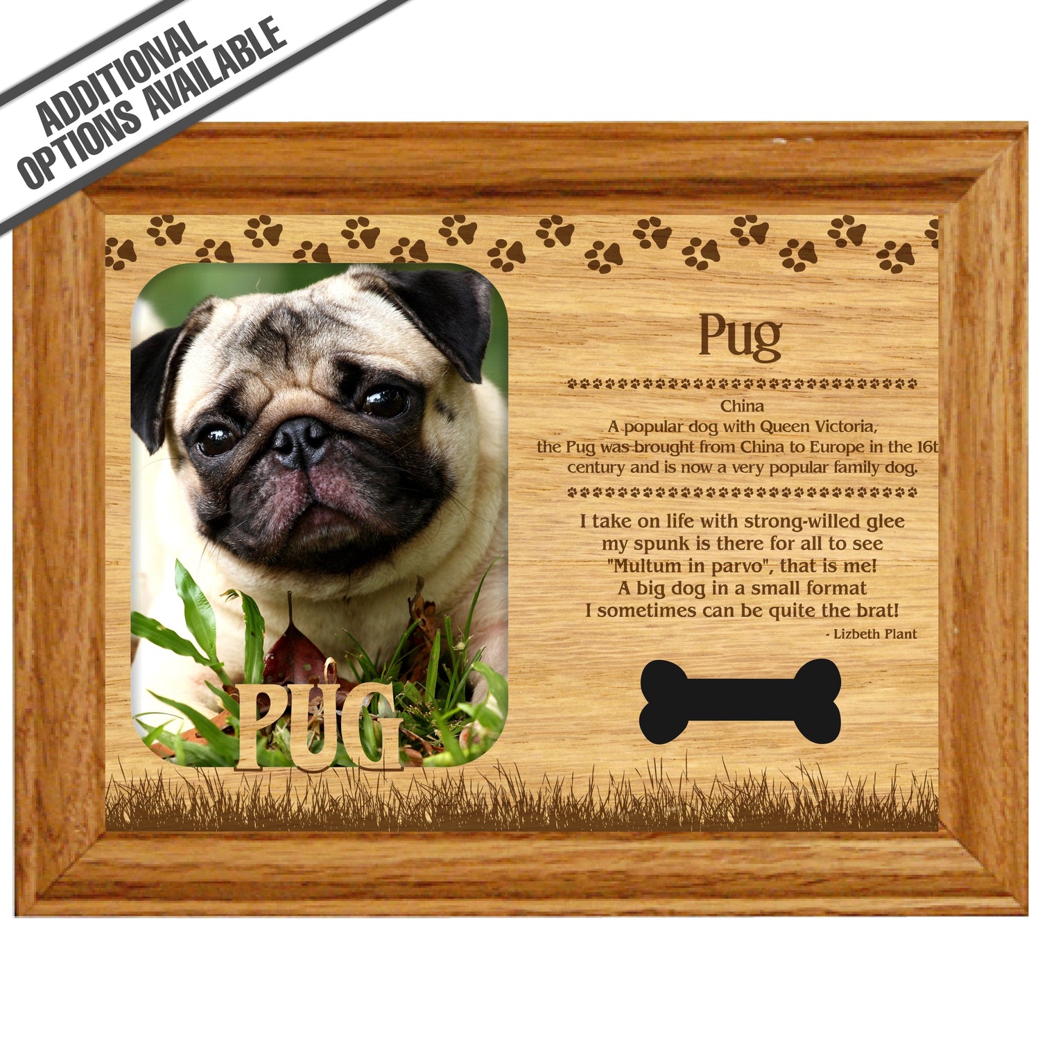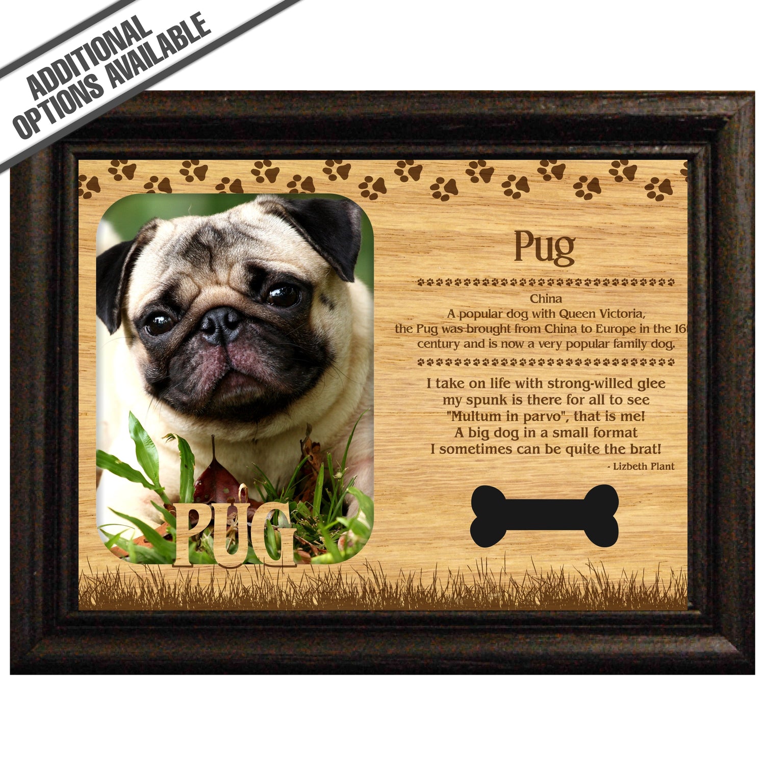 Celebrate the unique bond between you and your dog with our exquisite "Pug" wooden photo frame. This beautifully crafted wooden frame showcases engraved paw print, capturing the essence of your furry friend in a stylish and heartwarming way. Perfect for displaying your favorite photo, this frame not only serves as a cherished keepsake but also highlights the playful and loyal personality traits of the Pug. A thoughtful gift for dog lovers, it adds a personal touch to any home decor while honoring the love and companionship of your pet. Our FrameWorks magnetic mattes are the best way to accentuate any picture. Prefect for a fridge, locker, file cabinet and more, with a strong magnetic backing. Our FrameWorks material is lightweight making it a great souvenir to pack or mail.