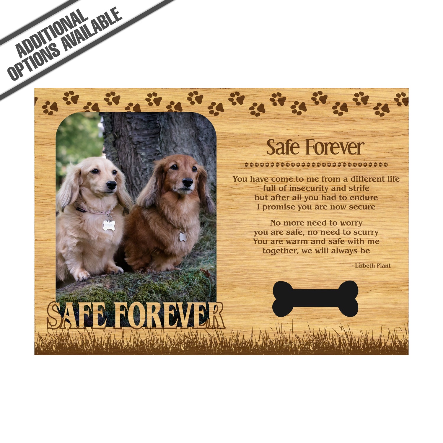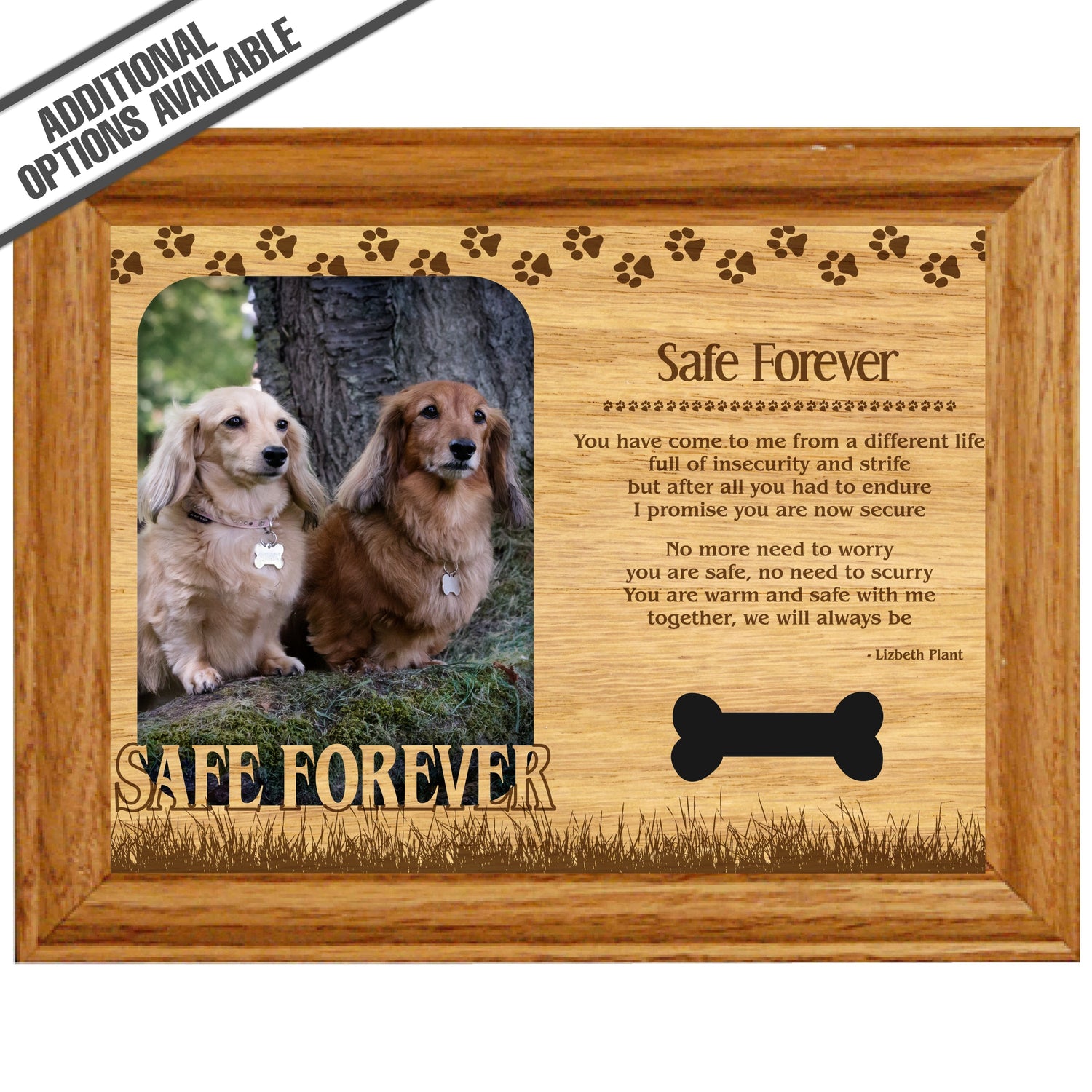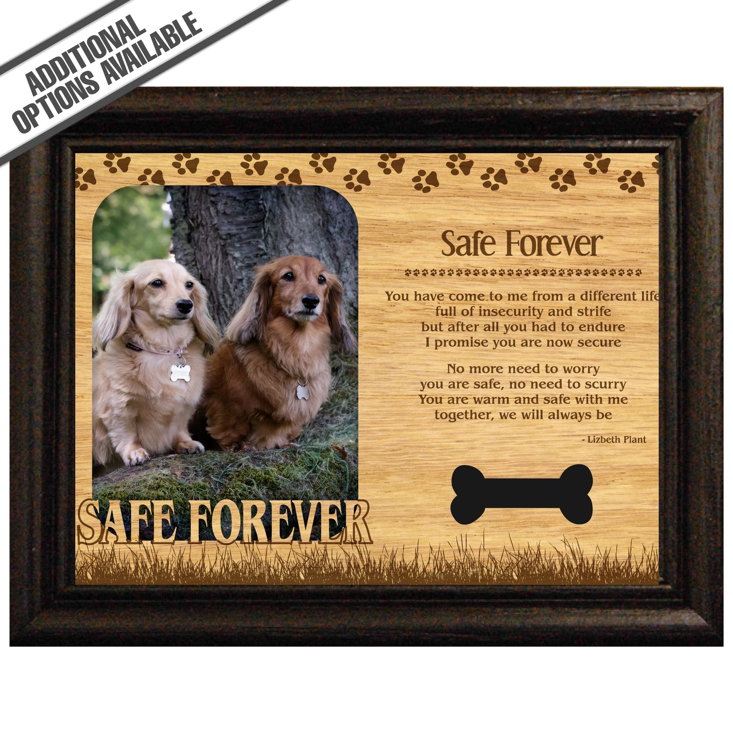 Celebrate the unique bond between you and your dog with our exquisite "Safe Forever" wooden photo frame. This beautifully crafted wooden frame showcases engraved paw print, capturing the essence of your furry friend in a stylish and heartwarming way. Perfect for displaying your favorite photo, this frame not only serves as a cherished keepsake but also highlights the playful and loyal personality traits of the Safe Forever. A thoughtful gift for dog lovers, it adds a personal touch to any home decor while honoring the love and companionship of your pet. Our FrameWorks magnetic mattes are the best way to accentuate any picture. Prefect for a fridge, locker, file cabinet and more, with a strong magnetic backing. Our FrameWorks material is lightweight making it a great souvenir to pack or mail.
