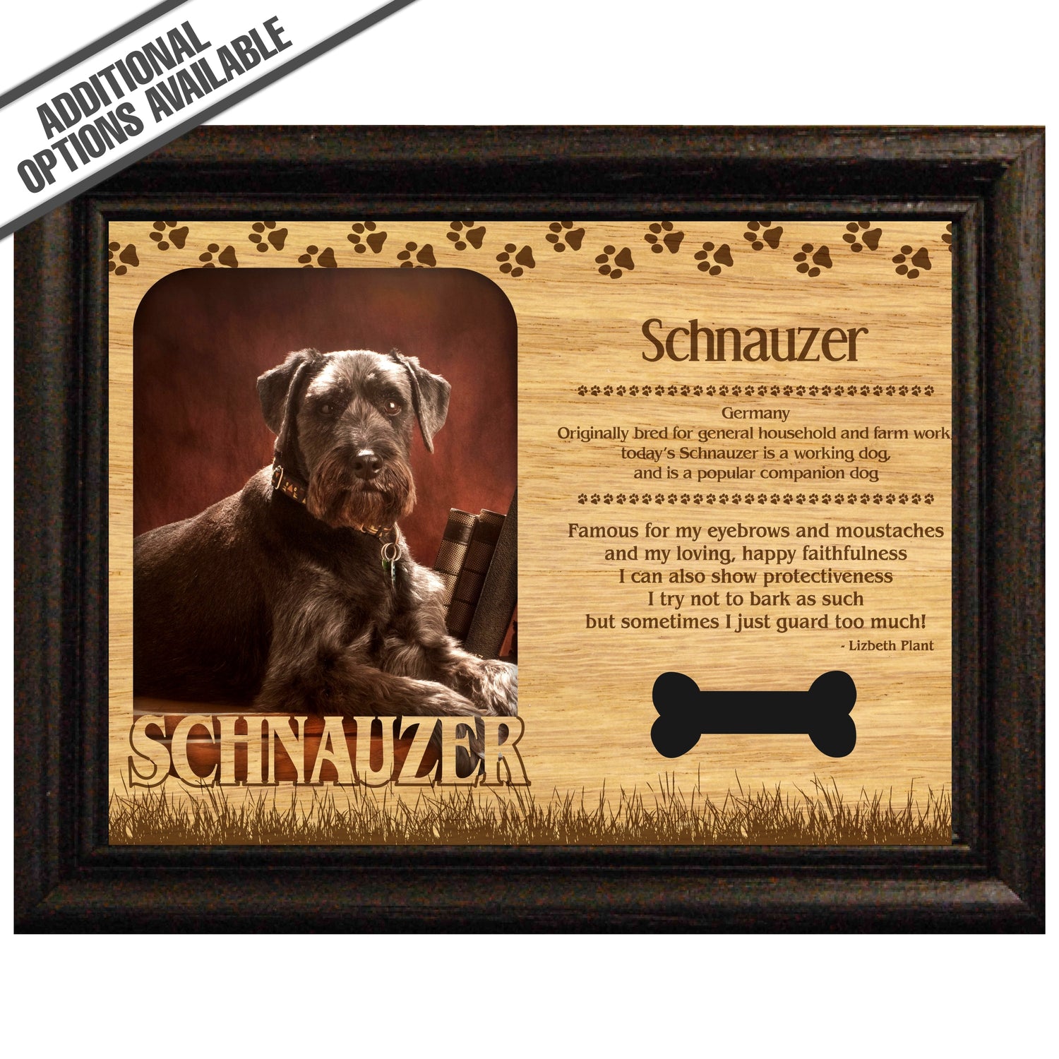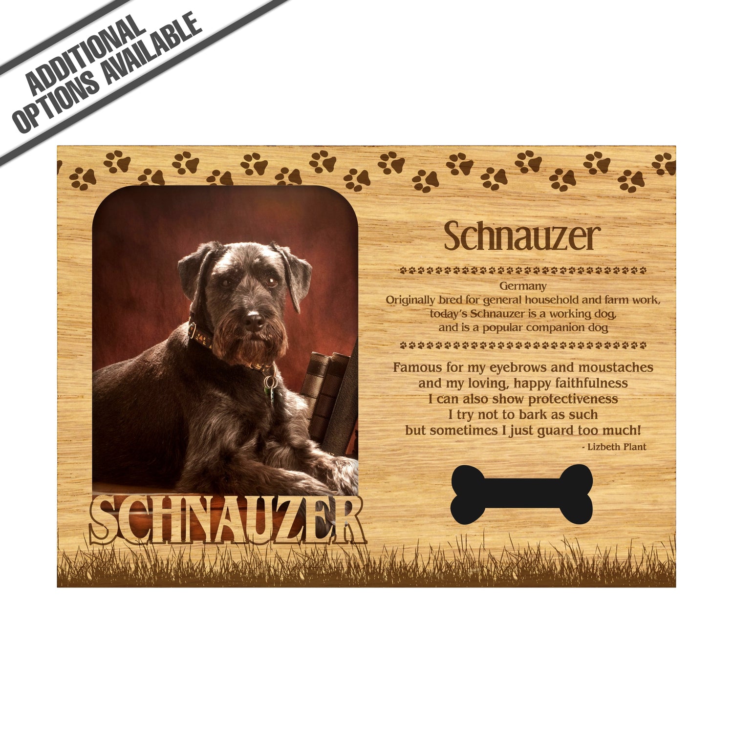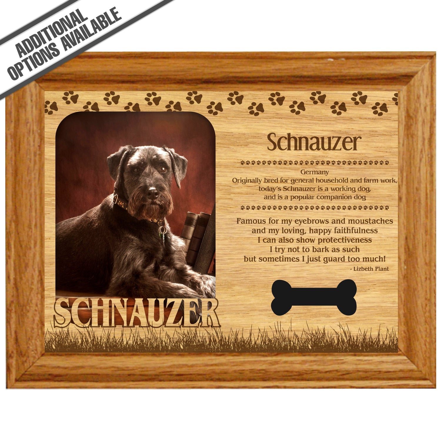 Celebrate the unique bond between you and your dog with our exquisite "Schnauzer" wooden photo frame. This beautifully crafted wooden frame showcases engraved paw print, capturing the essence of your furry friend in a stylish and heartwarming way. Perfect for displaying your favorite photo, this frame not only serves as a cherished keepsake but also highlights the playful and loyal personality traits of the Schnauzer. A thoughtful gift for dog lovers, it adds a personal touch to any home decor while honoring the love and companionship of your pet. Our FrameWorks magnetic mattes are the best way to accentuate any picture. Prefect for a fridge, locker, file cabinet and more, with a strong magnetic backing. Our FrameWorks material is lightweight making it a great souvenir to pack or mail.