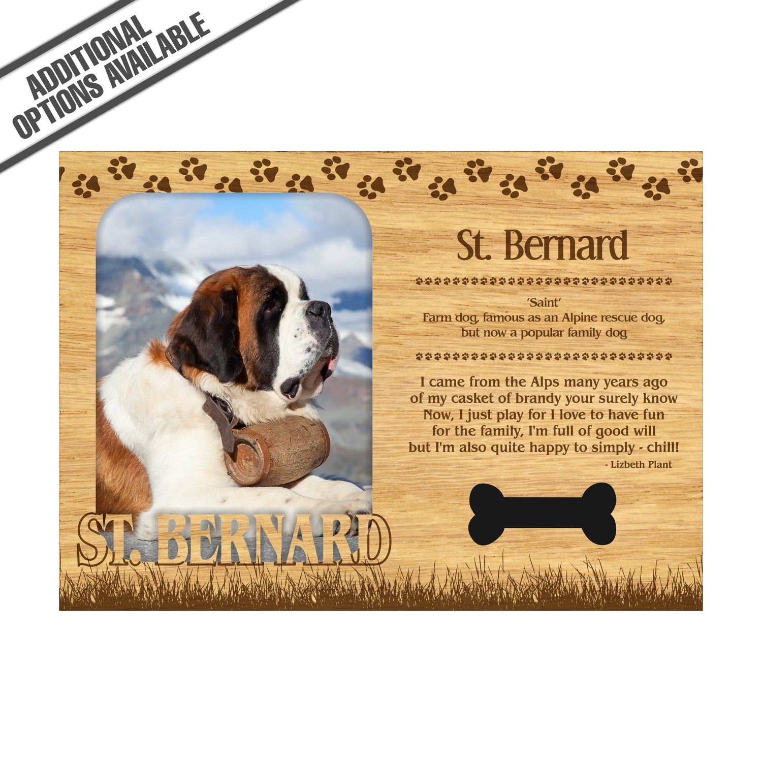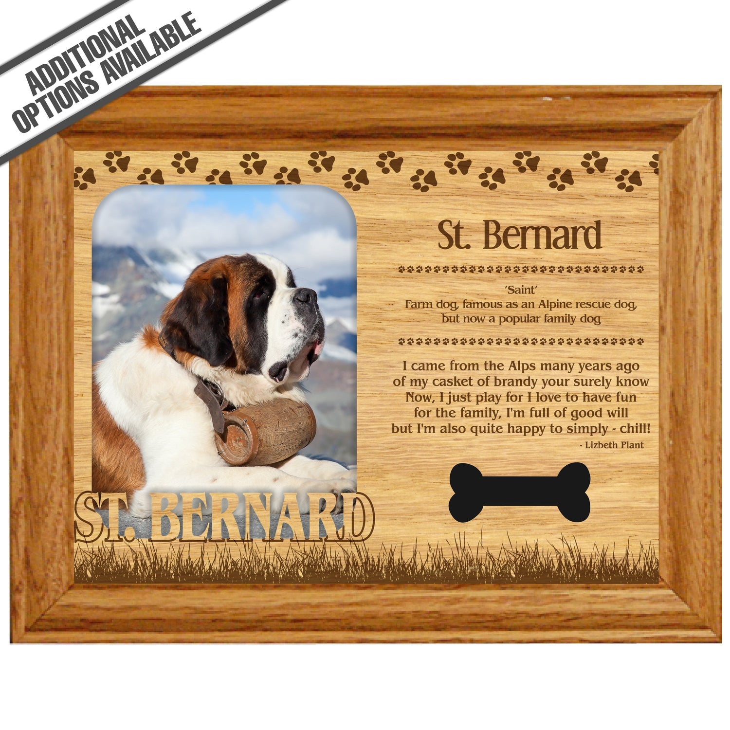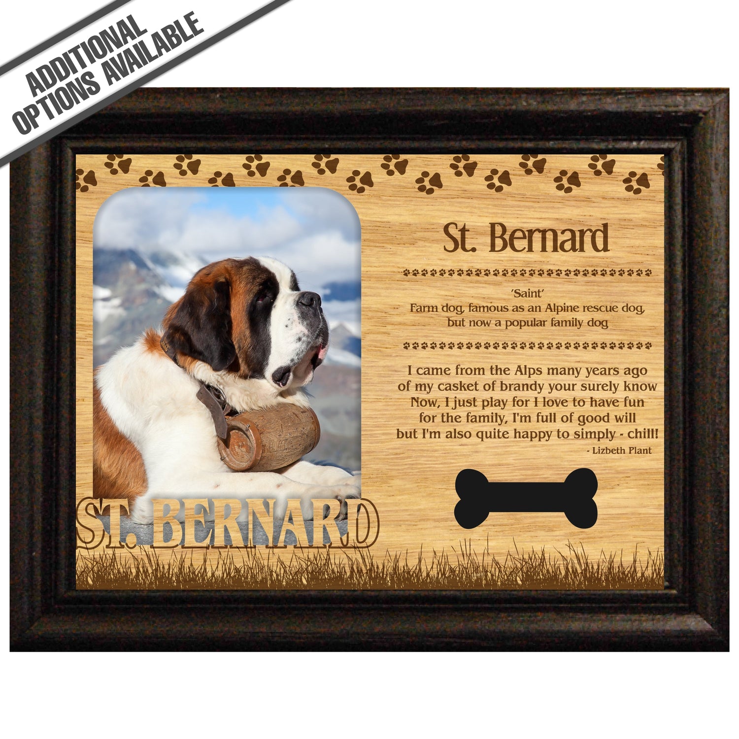 Celebrate the unique bond between you and your dog with our exquisite "St. Bernard" wooden photo frame. This beautifully crafted wooden frame showcases engraved paw print, capturing the essence of your furry friend in a stylish and heartwarming way. Perfect for displaying your favorite photo, this frame not only serves as a cherished keepsake but also highlights the playful and loyal personality traits of the Springer Spaniel. A thoughtful gift for dog lovers, it adds a personal touch to any home decor while honoring the love and companionship of your pet. Our FrameWorks magnetic mattes are the best way to accentuate any picture. Prefect for a fridge, locker, file cabinet and more, with a strong magnetic backing. Our FrameWorks material is lightweight making it a great souvenir to pack or mail.