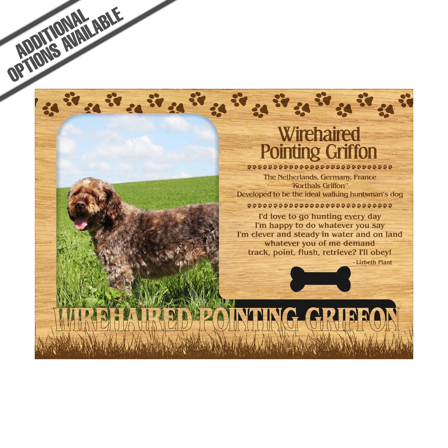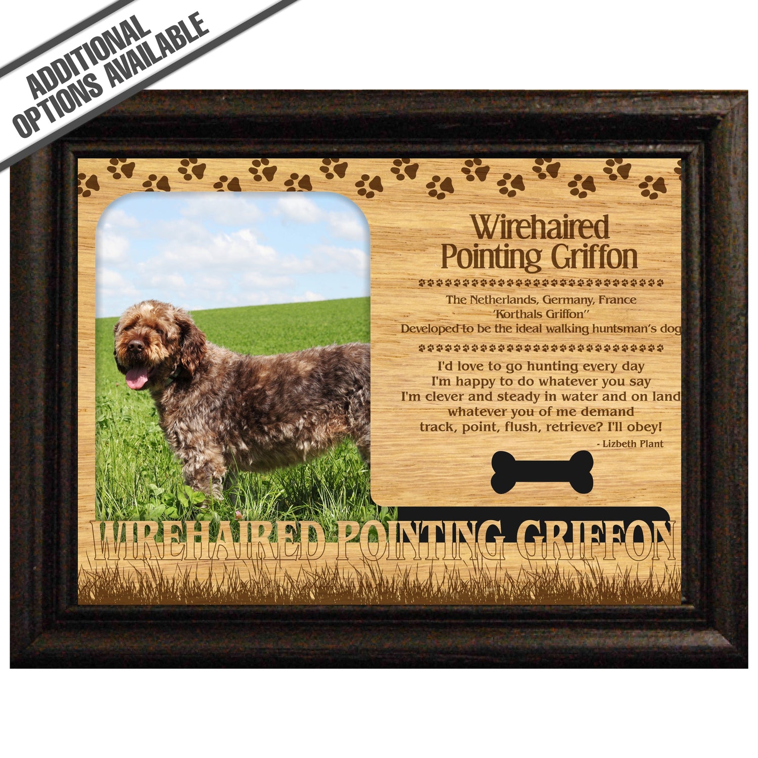 Celebrate the unique bond between you and your dog with our exquisite "Wirehaired Pointing Griffon" wooden photo frame. This beautifully crafted wooden frame showcases engraved paw print, capturing the essence of your furry friend in a stylish and heartwarming way. Perfect for displaying your favorite photo, this frame not only serves as a cherished keepsake but also highlights the playful and loyal personality traits of the Wirehaired Pointing Griffon. A thoughtful gift for dog lovers, it adds a personal touch to any home decor while honoring the love and companionship of your pet. Our FrameWorks magnetic mattes are the best way to accentuate any picture. Prefect for a fridge, locker, file cabinet and more, with a strong magnetic backing. Our FrameWorks material is lightweight making it a great souvenir to pack or mail.