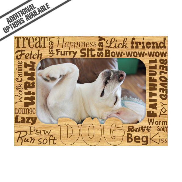 Celebrate your furry friend with our wooden Dog Word picture frame, a perfect blend of style and sentiment. Crafted from high-quality wood, this frame allows you to showcase your cherished memories while adding a unique touch to your home decor. Customized with dog words and sayings, it makes for an ideal gift for dog lovers or a delightful addition to your own collection. Elevate your space and honor the bond you share with your pet with this elegant and meaningful piece. Our FrameWorks magnetic mattes are the best way to accentuate any picture. Prefect for a fridge, locker, file cabinet and more, with a strong magnetic backing. Our FrameWorks material is lightweight making it a great souvenir to pack or mail.