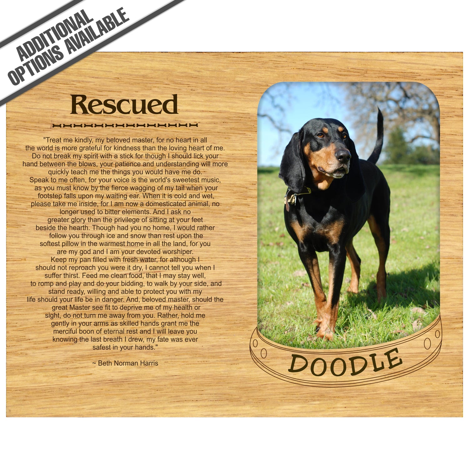 Celebrate the cherished memories of your beloved rescued dog with our exquisite "Rescue" photo frame. Crafted with care, this elegant plaque serves as a heartfelt tribute, allowing you to display a treasured photo of your furry friend while honoring their spirit. Made from durable materials, it features a beautiful design that complements any home decor, making it a perfect addition to your living space or a thoughtful gift for fellow pet lovers. Personalise it with your dog's name for a unique keepsake that makes a perfect gift for any dog lover. Preserve the joy and love your doodle brought into your life with this meaningful keepsake.  Our FrameWorks magnetic mattes are the best way to accentuate any picture. Prefect for a fridge, locker, file cabinet and more, with a strong magnetic backing. Our FrameWorks material is lightweight making it a great souvenir to pack or mail.