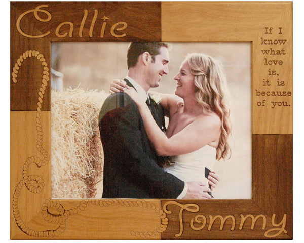 This fun, western-themed wedding picture frame is perfect for the cowboy couple in your life. Celebrate their new partnership with the engraved gift of this beautiful wooden photo frame. Add in their names, wedding date, or even a short message to this personalized wedding picture frame to customize your gift. Choose to keep or change the default message, “If I know what love is, it is because of you.” Item# fam0042