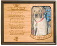 It reads, "I lost a treasured friend today the little dog who used to lay his gentle head upon my knee and shared his silent thoughts with me. He'll come no longer to my call retriever no more his favorite ball a voice far greater than my own has called him to his golden throne. Although my eyes are filled with tears I think him for the happy years he let him spend down here with me and for his love and loyalty. When it is time for me to go and join him there, this much I know I shall not fear the transient dark for he will greet me with a bark." Item# pet0180